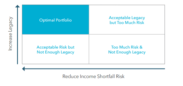 Income shortfall risk combines several important risk factors, including longevity risk (married couples have a 50% chance of one spouse living to age 933 ), sequence of returns risk (potential market losses at the beginning of retirement have a significant impact on retirement income) and inflation risk. An optimal retirement income portfolio provides a balance between increasing potential legacy and lowering income shortfall risk. The graph below illustrates the hypothetical relationship between income shortfall risk and legacy:
